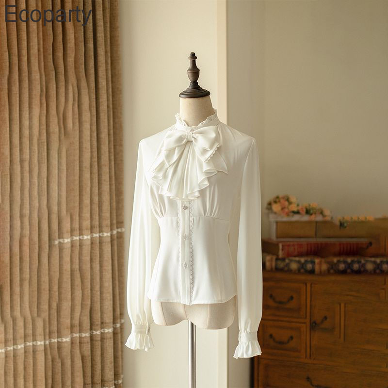 Women Sweet Vintage Suspender Dress Victorian Lolita A-Line Dress With Bowknot Long Sleeve Shirt Suit Girls Elegant 2pcs Dresses
