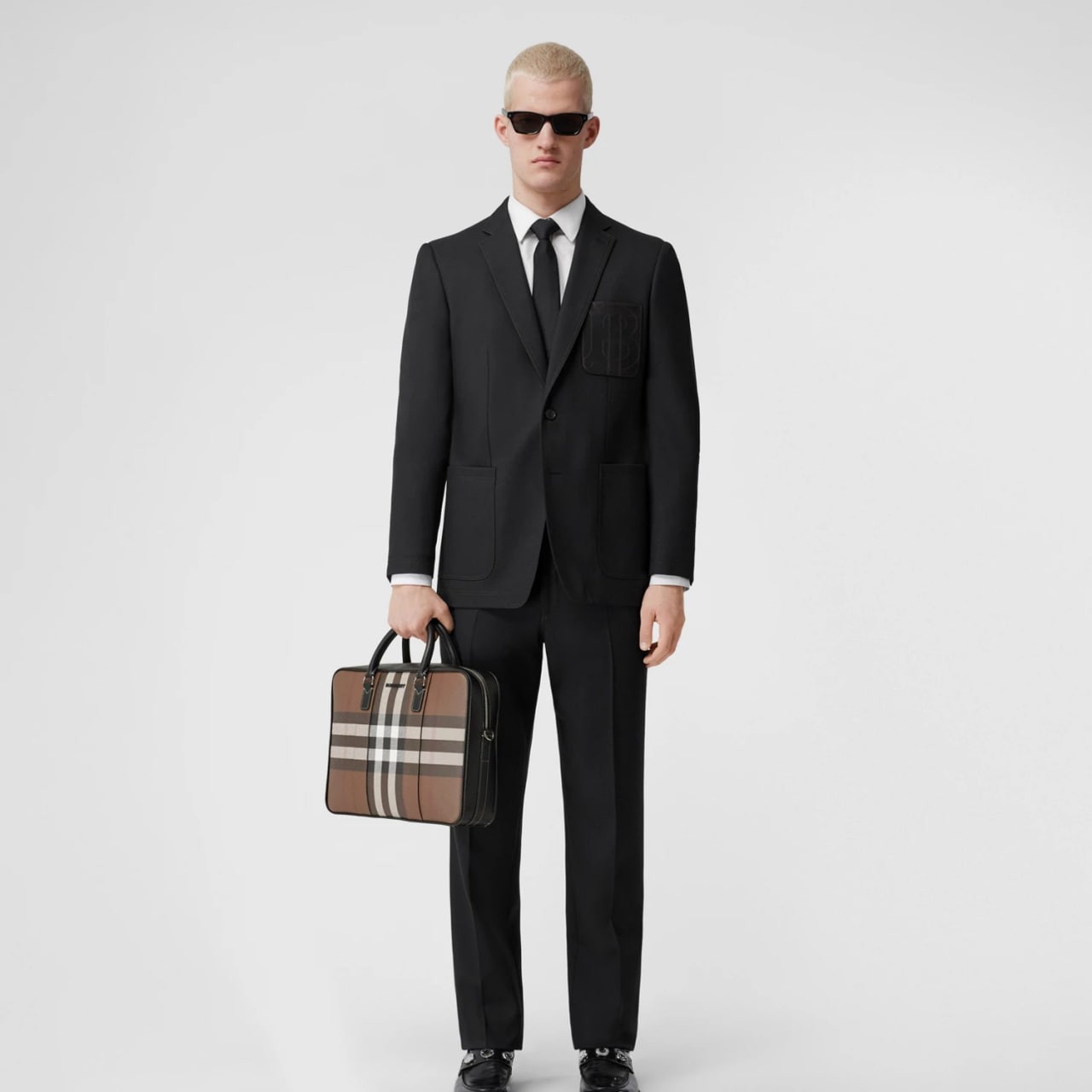The sophisticated, upright design is embellished with Burberry check and is highlighted by a rolled leather handle at the top and a 3D logo.